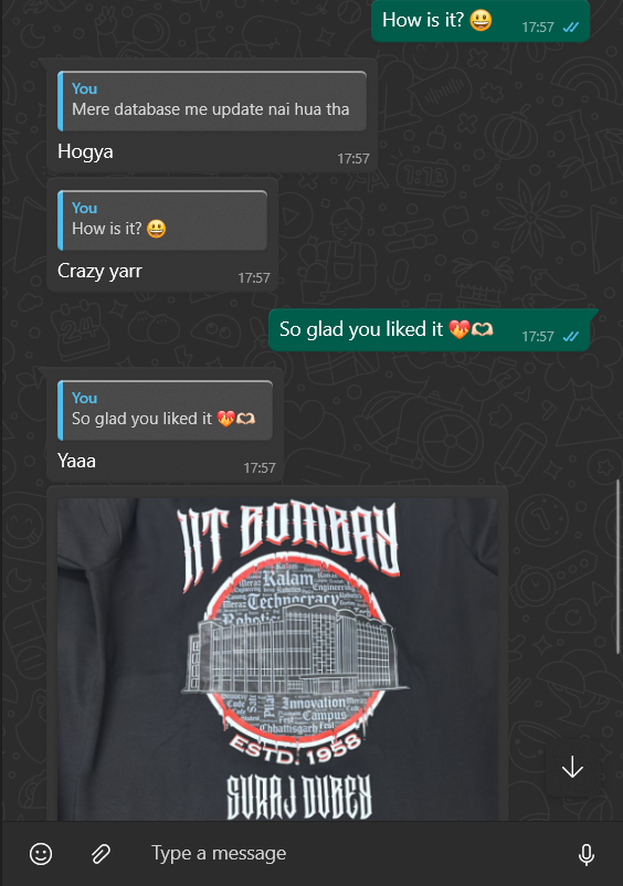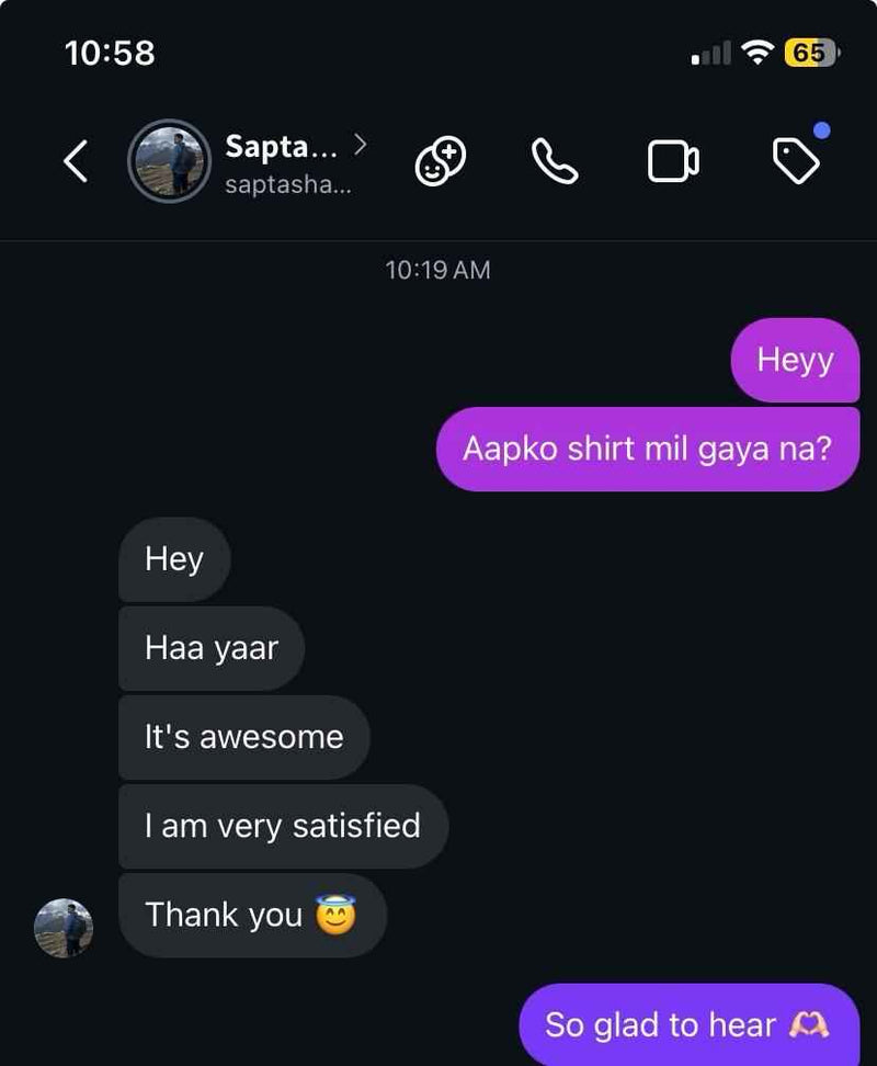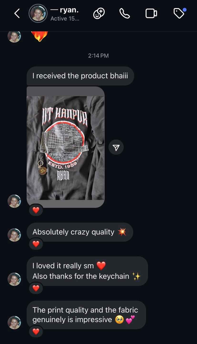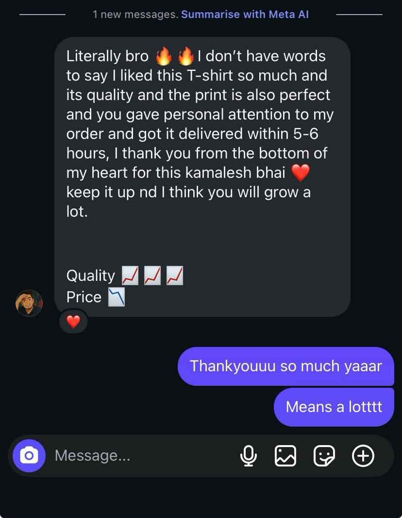 Literally bro , I don't have words to say, I liked this T-shirt so much and its quality and the print is also perfect and you gave personal attention to my order and got it delivered within 5-6 hours, I thank you from the bottom of my heart for this. Keep it up dude ❤️🔥