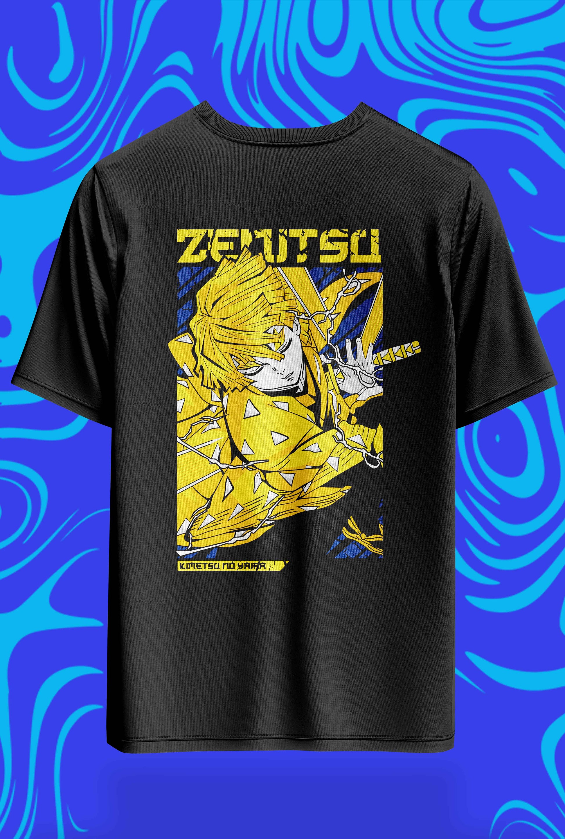 Back: The back features a vivid, powerful illustration of Zenitsu in a moment of pure focus and attack, his signature yellow haori and bright hair contrasting with the deep blue background. The illustration highlights the lightning-fast movement of his Thunder Breathing, First Form: Thunderclap and Flash. His name, ZENITSU, is boldly emblazoned above the artwork, a declaration of his thunderous skill, with the series title KIMETSU NO YAIBA subtly placed below.