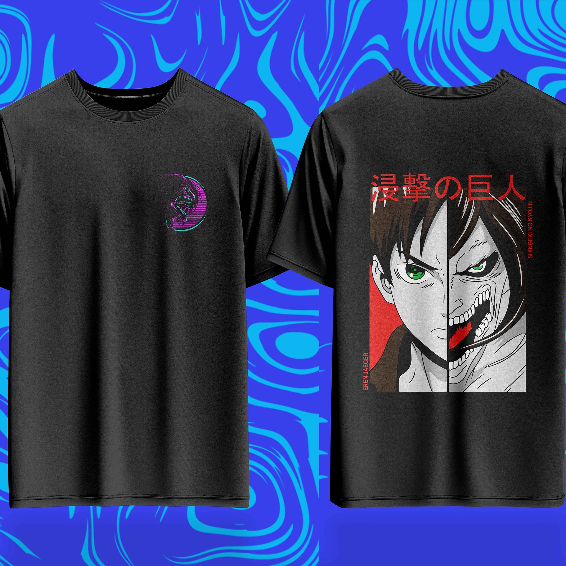 Back: A stunning split-portrait confronts the viewer with the core conflict of the series. One half reveals Eren's human face, his gaze burning with an iconic, emerald-green resolve. The other half unleashes the raw fury of his Attack Titan, rendered in stark greyscale with aggressive red accents. Flanked by his name and the series' title, and crowned with the original Japanese kanji 進撃の巨人 (Shingeki no Kyojin), this design is a powerful and focused character study.