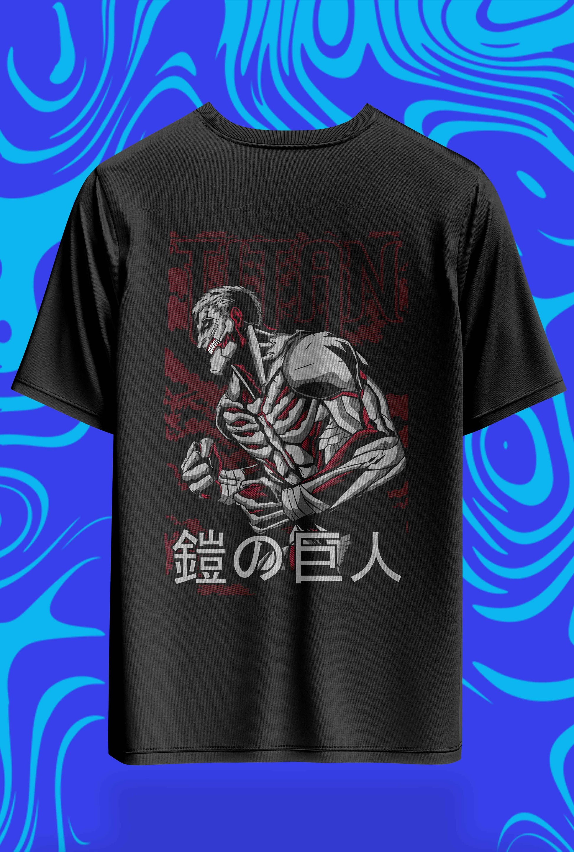 Back: A gritty, battle-worn illustration captures the Armored Titan in a powerful, defensive stance. The textured artwork highlights every hardened plate of its nearly impenetrable skin, with visceral red accents revealing the flesh and blood of the warrior within. Crowned with a bold, distressed 'TITAN' insignia and anchored by the authentic Japanese kanji for 'Armored Titan'—鎧の巨人 (Yoroi no Kyojin)—this design is a raw display of power.